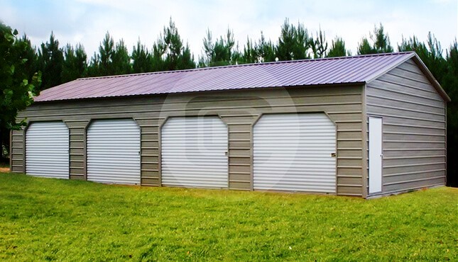 This side-entry metal storage building has measurements of 20’W x 45’L x 10’H. It features four 9’x8′ roll-up garage doors all with Dutch-style framed openings and one standard walk-in door on one end.