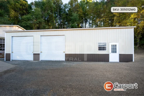 The free-standing metal workshop pictured above has measurements of 24’W x 25’L x 9’H with one 8’x7’ frame-out. It has been designed and installed with a vertical roof to better protect its contents from harsh weather elements. This structure can be used as a storage unit, a dog kennel, a hobby hut, or whatever you may desire. Or if you prefer, you can use our custom 3D Estimator to create your very own unique metal building. If you can dream it, we can build it.