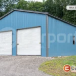 Pictured above is an all-vertical 24’W x 60’L x 10’H utility workshop building. The length includes 40′ of enclosed area and 20’ for the porch. Included are two 10’x8′ roll-up garage doors, two walk-in, French doors added by the customer, and three 30″x30″ windows. The workshop is also certified for 140mph wind speed and 30spf snow load. This structure does include single bubble roof insulation; however, for additional insulation you will need to speak with one of our building specialists.