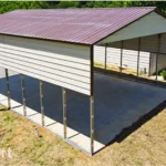 Pictured above is a 28’W x 40’L metal garage with a vertical-style roof. This Garage has good clearance for large vehicles and machinery. Designed with 14-gauge galvanized steel tubing and enclosed with 29-gauge sheet panels, this metal garage is certified for heavy snow loads and high winds.