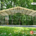 This 30’-Wide metal garage has been designed and installed with a vertical roof, horizontally enclosed sides and ends.