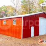 This enclosed building is 30’W x 30’L x 11’H with an 18’W x 30’L x 11’H center section. Featured with the center section is one 10’x10’ garage door, one standard walk-in door, and one standard window. The lean-to measures at 12’W x 30’L x 8’H and has one 10’x7’ garage door on the front wall. This steel structure is perfect for sheltering your larger agricultural equipment, machinery, and larger vehicles. You could even transform it to be a personal work space, body shop, or storage for your additional household items. For more information on this structure or other custom metal building, give us a call today at (980) 321-9898.