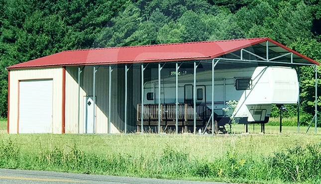 This structure can be used to shelter your RV or camper from the elements, even vehicles or lawn equipment. The enclosed utility can be used for anything you would like. She shed man cave, workshop, art studio, or just additional storage.