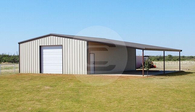 The lean-to garage shown above is 44’W x 40’L x 13’H whereby the enclosed garage is 24’W x 40’L x 13’H. It includes one 12’x12’ garage door, one standard walk-in door, and one 20’W x 40’L lean-to. This multi-purpose garage is an excellent choice for homeowners who have more than one need. For example, you can shelter your vehicles in the garage while you store bicycles, gardening tools, and equipment being used often under the lean-to.