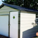 This commercial garage building features, 12′ Side Eave Height, 36×80″ Premium Walk in Door , 36×36″ Premium Windows, 12×12′ Roll up Garage Doors, 10×10′ Roll up Garage Doors, and a vertical roof.